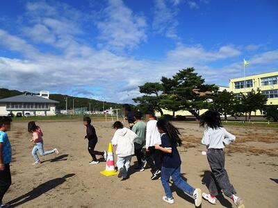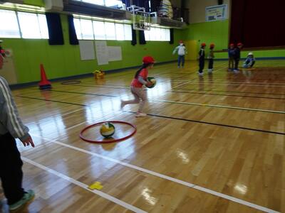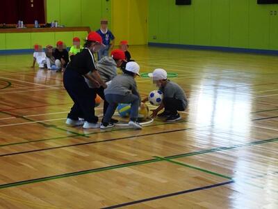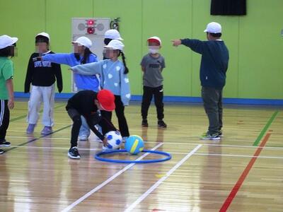 自分たちの陣地に、他のグループのボールを持ってきて確保するというゲームですが、ボールを持ってくると同時に、自分たちのボールが取られることもあり、油断できません。