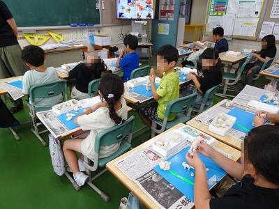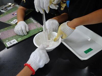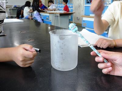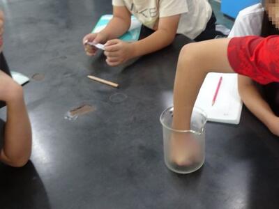 何をしているのかを聞くと、食塩チームとみょうばんチームに分かれて、水の温度によって溶ける量が違うのかを調べているとのこと。