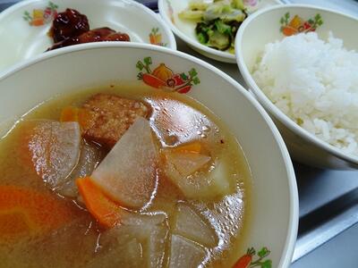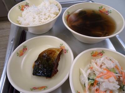 ごはん、すまし汁、さばしょうが煮、味噌マヨサラダ