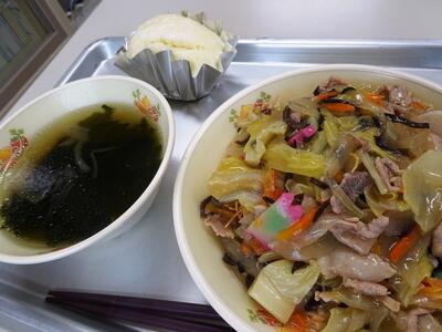 皿うどん、わかめスープ、手作りあんこ蒸しパン