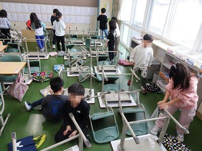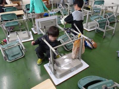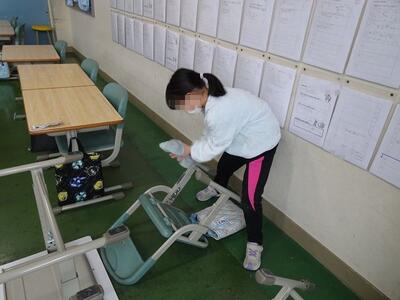 昨日、1年生は、この1年間お世話になった机とイスの足の汚れを落としていました。