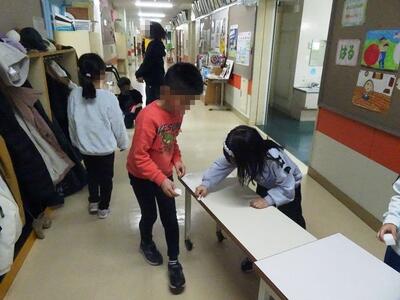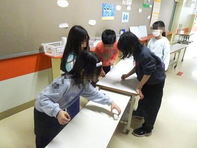 廊下では、給食の際にお世話になった配膳台を磨いている人もいました。