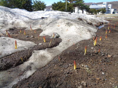 校舎前の花壇。雪の間からチューリップの芽が顔を出しています。
